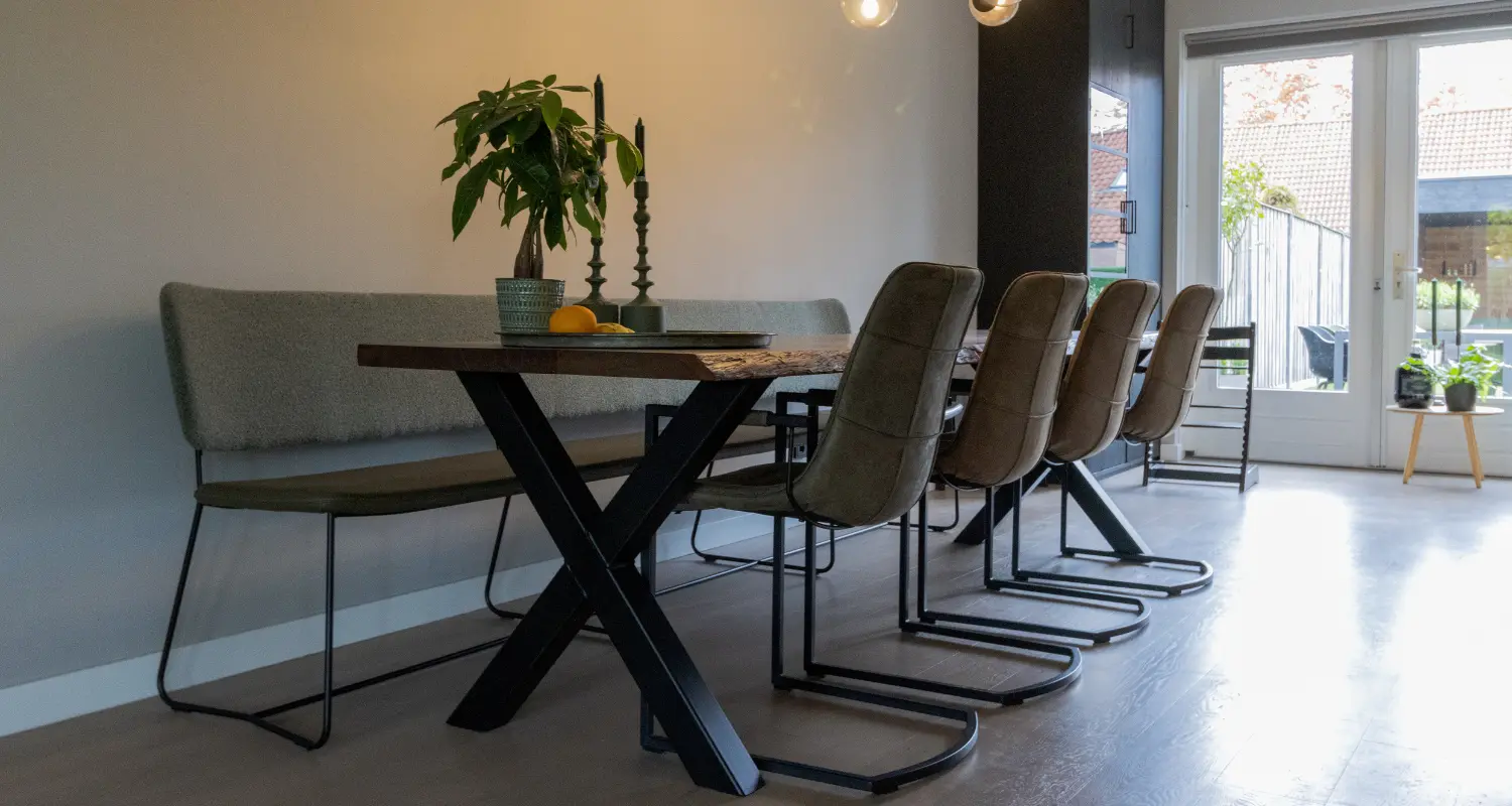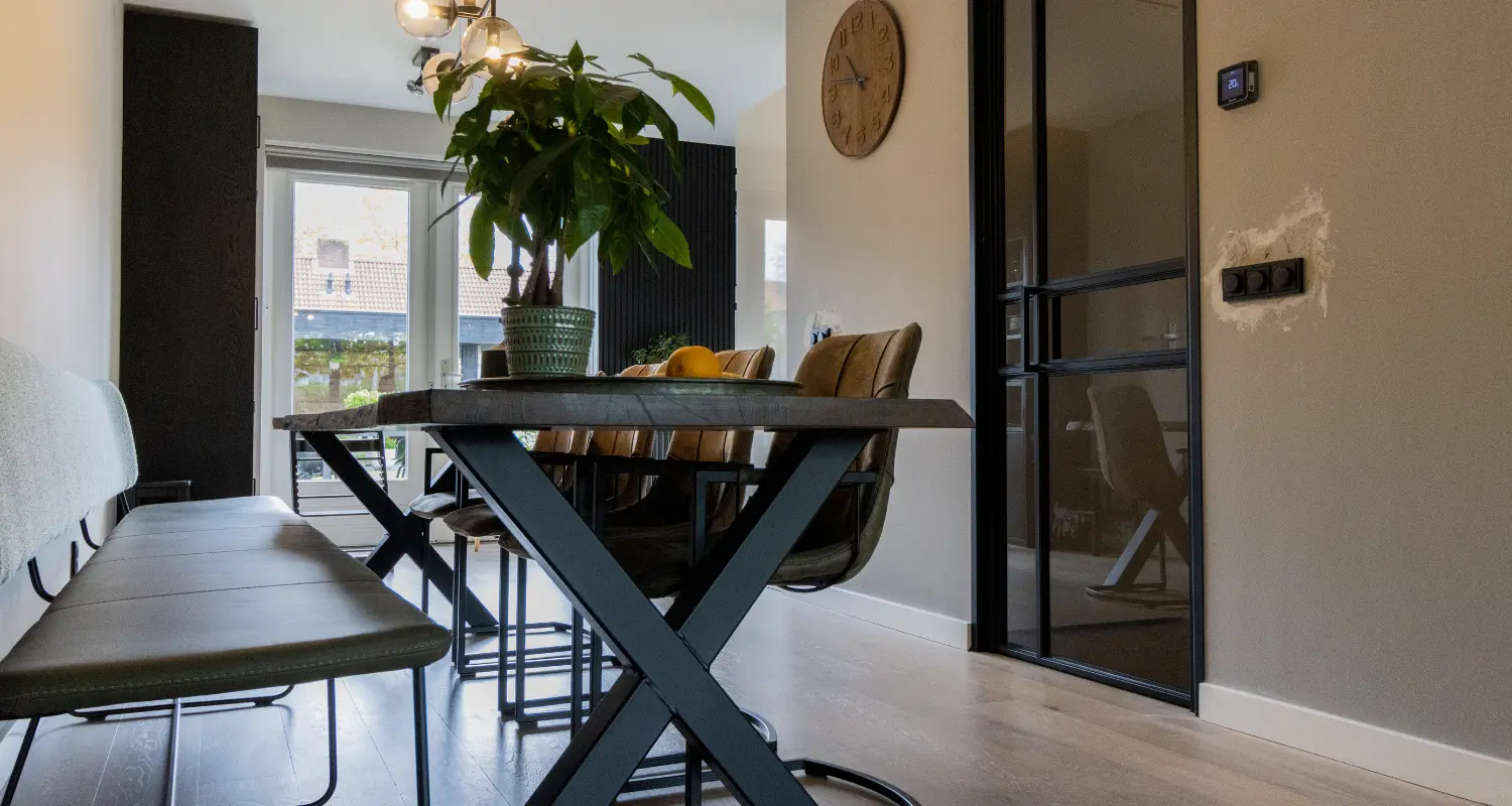 Na wat speurwerk online liep de klant begin april 2023 uit nieuwsgierigheid onze showroom binnen. Ze waren verhuisd naar hun nieuwe woning in Etten Leur en op zoek naar een stalen scharnierdeur en eettafel. In de showroom hebben we onze diversiteit aan houtsoorten en de tal aan mogelijkheden met hen besproken. Vervolgens hebben we samen nog een kijkje genomen in onze werkplaatsen, de plek waar alles op maat wordt geproduceerd bij Weij. Nadat ze voldoende inspiratie hadden opgedaan, gingen ze met wat huiswerk en diverse hout stalen weer naar huis.