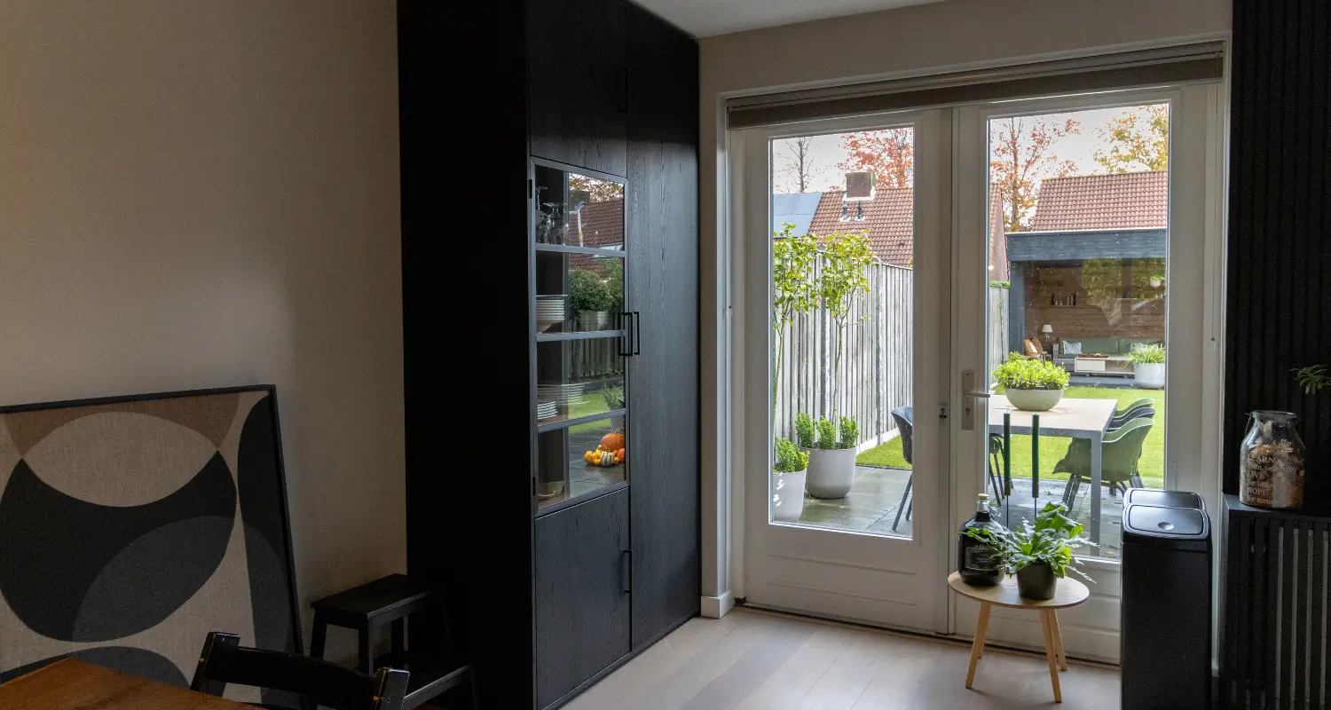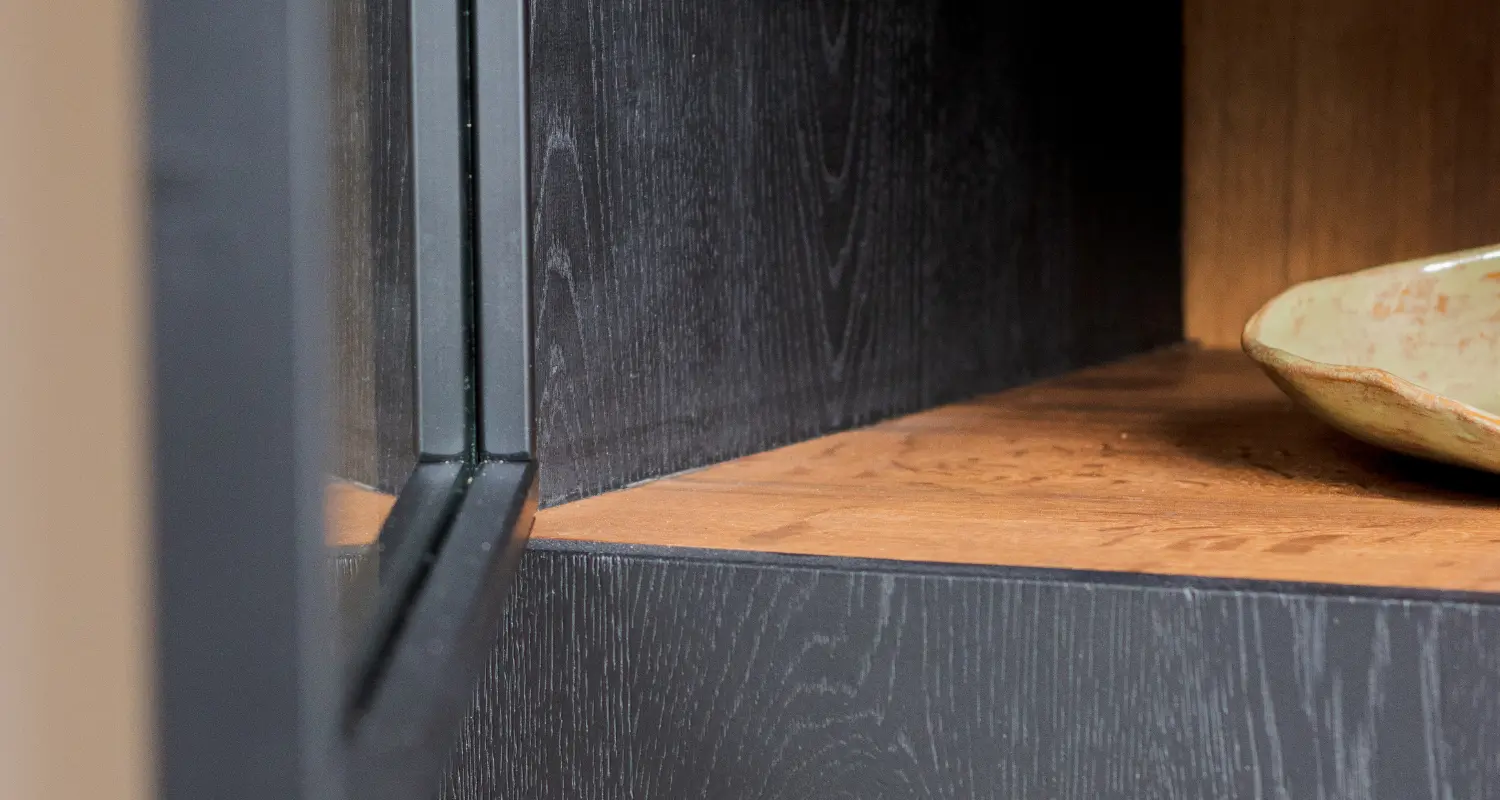 Twee weken na hun bezoek aan onze showroom, kwam de klant al weer terug. Dit keer om een akkoord te geven op de offertes van de eettafel en de stalen deur. Daarbij nog wel de vraag of de meubelmaker bij hen thuis kon langs komen om nog wat te sparren over de mogelijke andere meubelstukken. Zo gezegd zo gedaan. Diezelfde week ging onze hoofdmeubelmaker Robbert bij ze langs. Daar werden alle producten die de klant ook nog graag wilden hebben besproken. Zo wilden ze graag een stalen trapleuning, een roomdivider, een bovenkast voor in de keuken, een lambrisering rond de verwarming en een mooie buffetkast voor in de eetkamer. Alles gemaakt in eikenhout en gecombineerd met diverse soorten afwerkingen. Zo is er bij de buffetkast en de kast boven de keuken gekozen voor onze houtsoort Vintage oak met daarnaast eikenhout zwart dekkend behandeld. Het industriële tintje is ook in verschillende meubels verwerkt, zoals bijv. de handvatten van de kasten. Na het inmeten van de locatie konden we aan de slag!