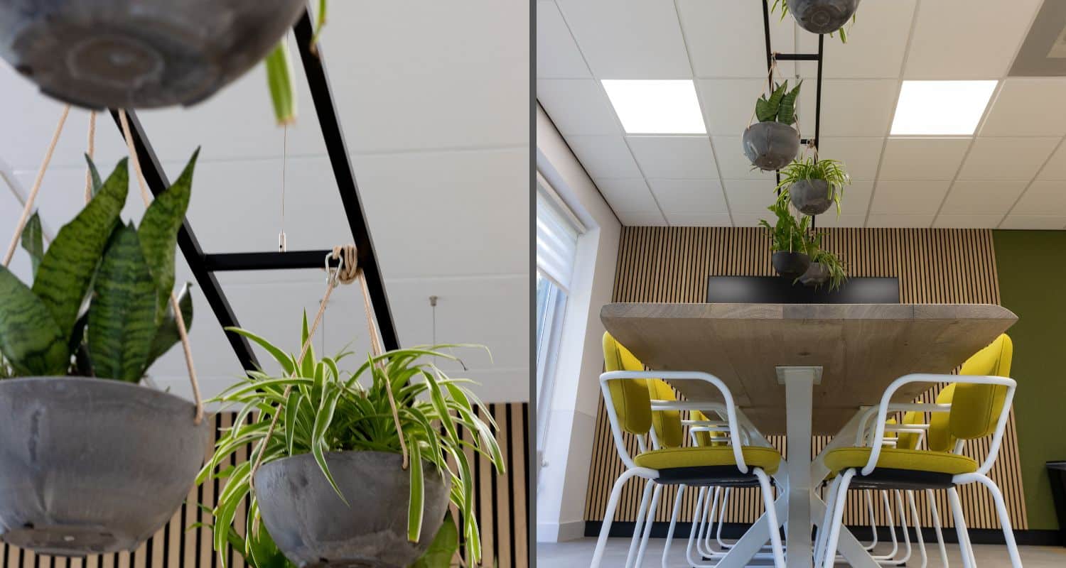 Zowel in de grote kantoorruimte als in de iets kleinere ruimte is een boomstamtafel geplaatst. De tafels zijn robuust, natuurlijk en industrieel. Ze zijn namelijk voorzien van een wit stalen matrix frame. Boven de tafels is een industrieel stalen rek opgehangen. Dit rek fungeert als plantenrek en creëert een gezellige en sfeervolle plek. Ook de ontvangstbalie is van zo’n leuk industrieel stalen rek voorzien. De plantjes verwelkomen je!
