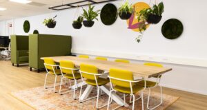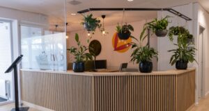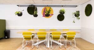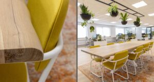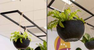 Zowel in de grote kantoorruimte als in de iets kleinere ruimte is een boomstamtafel geplaatst. De tafels zijn robuust, natuurlijk en industrieel. Ze zijn namelijk voorzien van een wit stalen matrix frame. Boven de tafels is een industrieel stalen rek opgehangen. Dit rek fungeert als plantenrek en creëert een gezellige en sfeervolle plek. Ook de ontvangstbalie is van zo’n leuk industrieel stalen rek voorzien. De plantjes verwelkomen je!