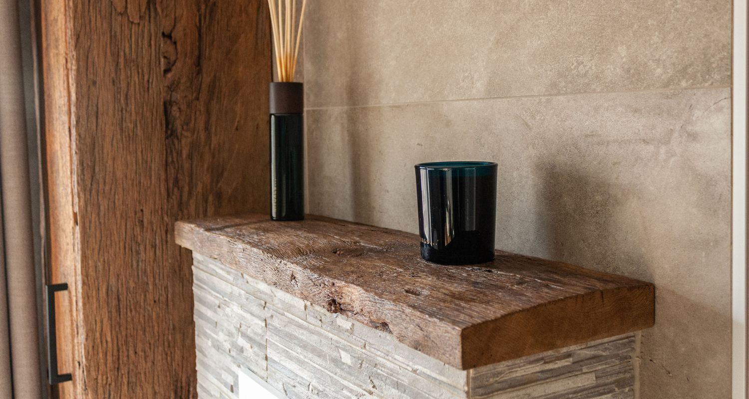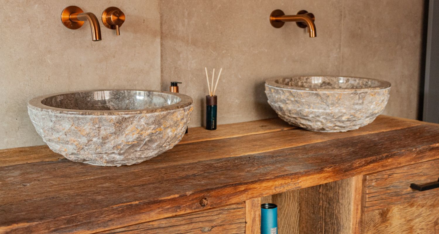 De landelijke en robuuste stijl is ook toegepast in de badkamer.