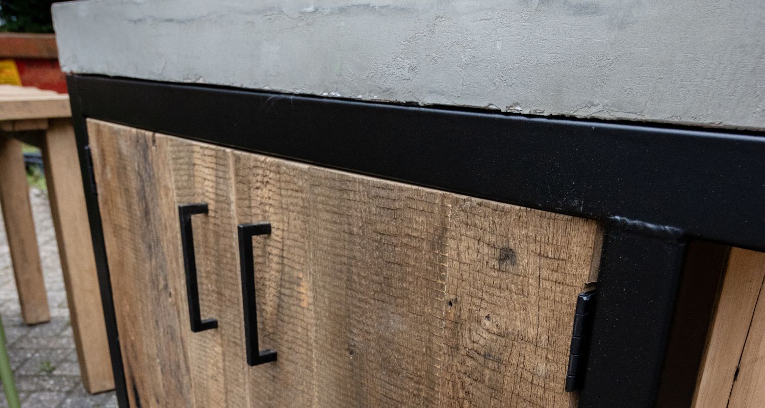 Het meubel kan op maat worden gemaakt, maar de standaard afmetingen zijn 170 cm x 80 cm x 90 cm (lengte x breedte x hoogte). Onder het meubel zitten 4 wielen, waardoor de barbecuetafel makkelijk naar binnen gereden kan worden. Het is wel zo fijn dat het meubel droog wordt gehouden, zowel voor de barbecue als het meubel zelf. Omdat we de bbq zelf niet verkopen, ben je zelf verantwoordelijk voor de juiste communicatie en afmeting omtrent de bbq. Het meubel wordt in de werkplaats op maat gemaakt met de informatie die bij Weij bekend is.