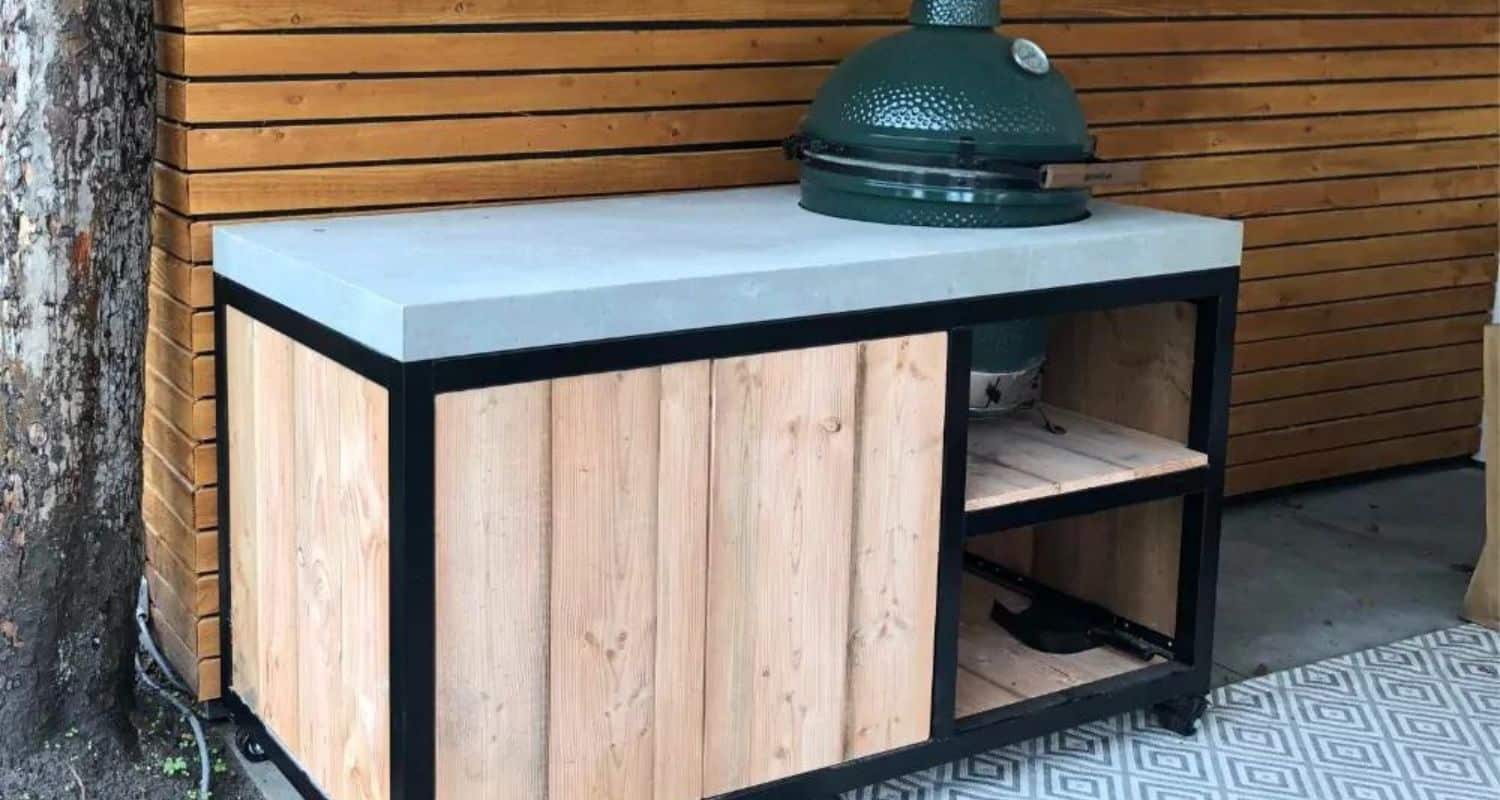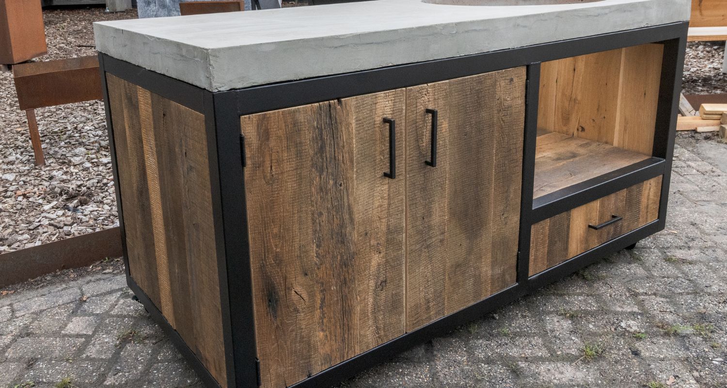 Deze BBQ tafel is ideaal voor iedereen die graag buiten een lekkere steak of een grote kip klaar wilt maken. Het gehele frame is gemaakt van staal, is behandeld voor buiten gebruik en is vervolgens zwart gepoedercoat. De deurtjes, zijkanten en plankjes zijn gemaakt van douglas hout, Maar is ook mogelijk is nieuw of oud eiken. Het blad is gemaakt van massief beton, mooi robuust dus! Bij deze tafel zit geen barbecue.