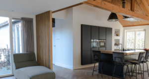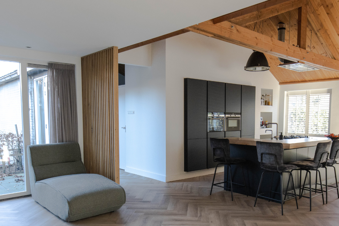 De keuze viel op eikenhout, vanwege de warme uitstraling en tijdloze look. Het eikenhout past perfect bij de rest van het interieur en brengt rust én karakter in de ruimte. De roomdivider is volledig op maat gemaakt, waarbij rekening is gehouden met de afmetingen, looproutes en lichtinval.