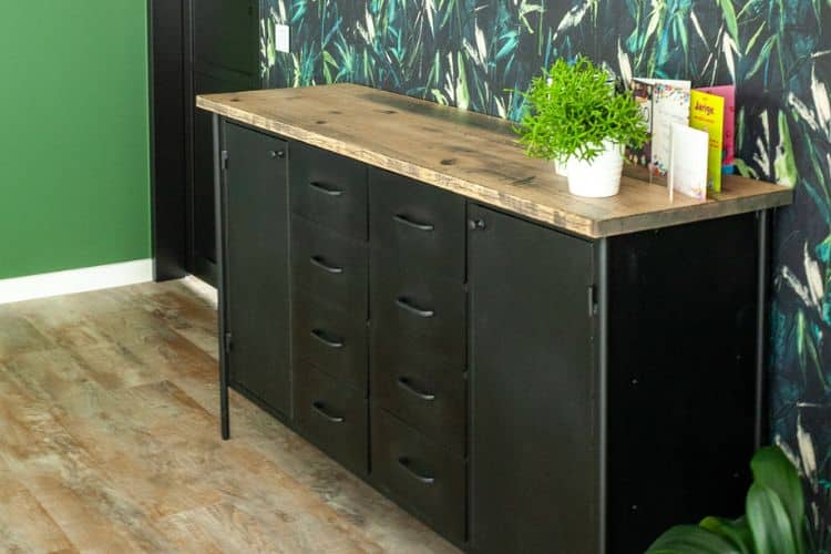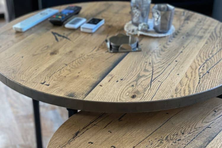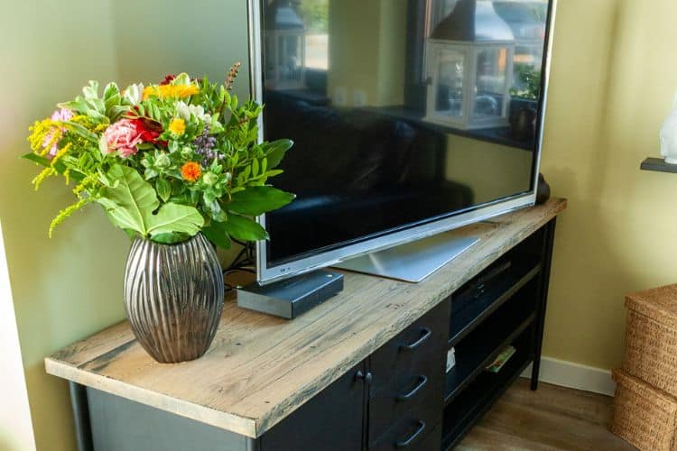 Het tv-meubel dat de klant al had staan bestond helemaal uit staal. Om dit passend te maken bij de rest van het interieur is ervoor gekozen om het bovenste blad te produceren in Wagondelen look.