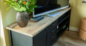 Het tv-meubel dat de klant al had staan bestond helemaal uit staal. Om dit passend te maken bij de rest van het interieur is ervoor gekozen om het bovenste blad te produceren in Wagondelen look.