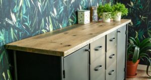 En ook het bovenste blad is bij het dressoir geproduceerd in de houtsoort Wagondelen look.